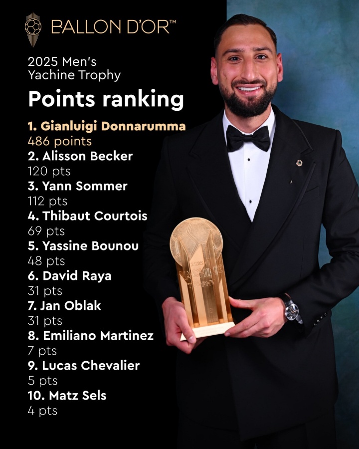 09月27日訊 2025年雅辛獎排名詳情公布,榮獲該獎項的意大利門將多納魯馬以486分?jǐn)鄬宇I(lǐng)先,第2名阿利森獲得120分,第3名索默獲得112分。