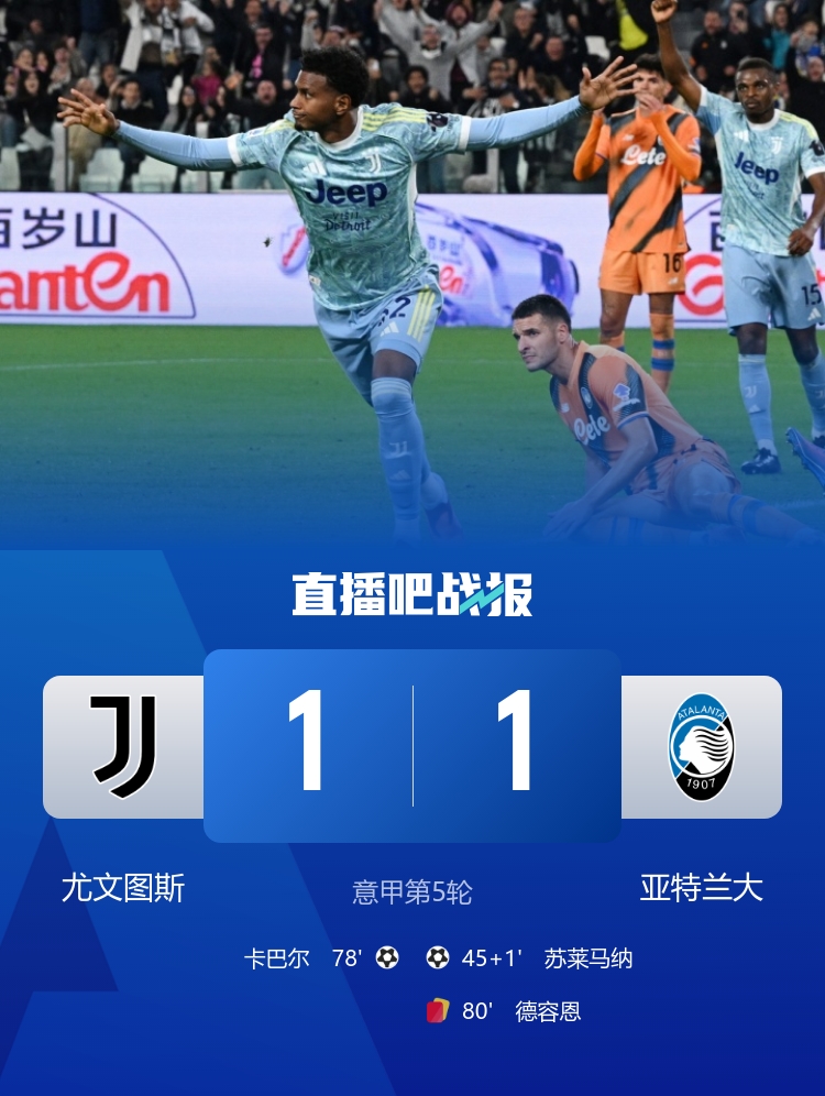 全場比賽結(jié)束,尤文圖斯主場1-1戰(zhàn)平十人亞特蘭大。