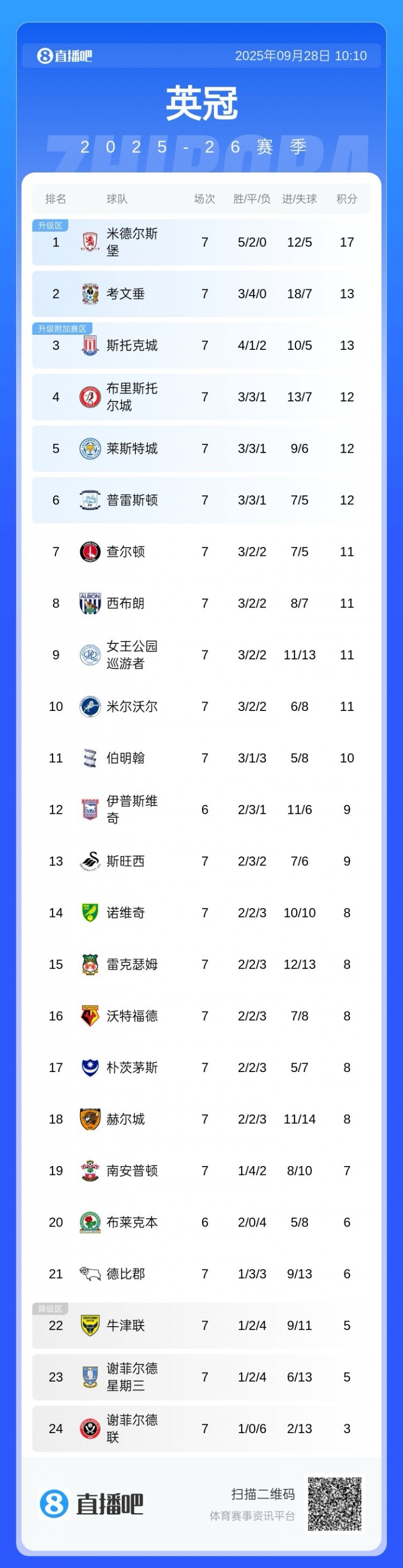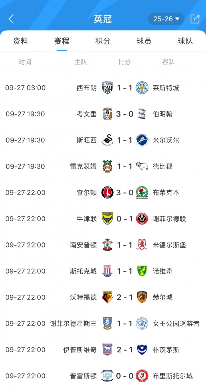 09月28日訊 英冠昨日第七輪比賽全部結(jié)束。
