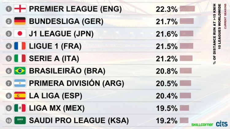 9月29日訊 CIES盤點各聯(lián)賽高速跑動距離占比排名,英超居首,德甲第二,西甲僅第八。(高速跑動定義:>15公里/小時)