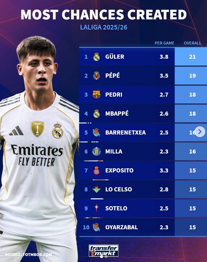 9月30日訊 德轉(zhuǎn)盤點了本賽季西甲創(chuàng)造機會榜單,其中居勒爾共計21次創(chuàng)造機會居首,具體如下(場均數(shù)據(jù)+總數(shù)據(jù)):