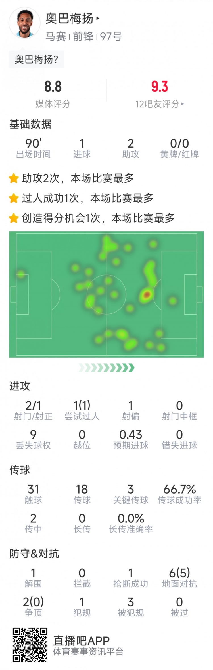 10月1日訊 在本輪歐冠,馬賽4-0大勝阿賈克斯。本場(chǎng)比賽奧巴梅揚(yáng)1球2助攻,以下為他在本場(chǎng)數(shù)據(jù):