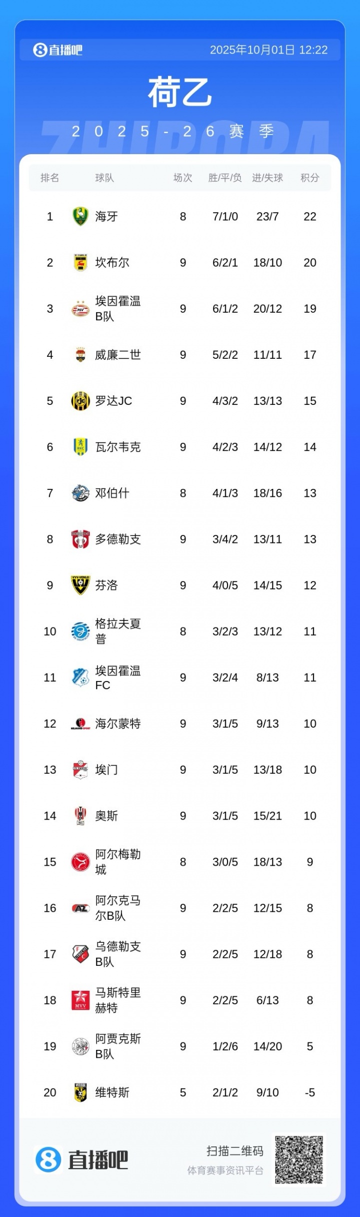 10月01日訊 今日荷乙一場比賽,維特斯4-2埃門。