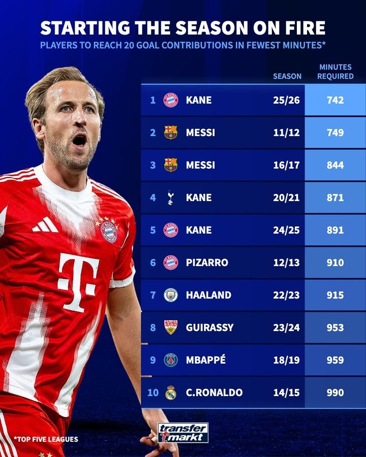本賽季開局,凱恩僅用742分鐘時間就為拜仁造了20個進(jìn)球(進(jìn)球+助攻),比2011年的梅西快了7分鐘,刷新歷史。
