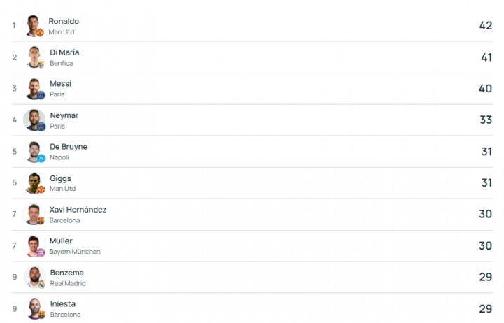 德布勞內當前歐冠助攻31記,與吉格斯并列第五,C羅、迪馬利亞、梅西前三。