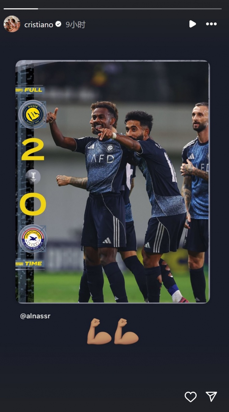 此役C羅輪休沒有出戰(zhàn),他在社交媒體上曬出比賽海報(bào),慶祝利雅得勝利取勝。