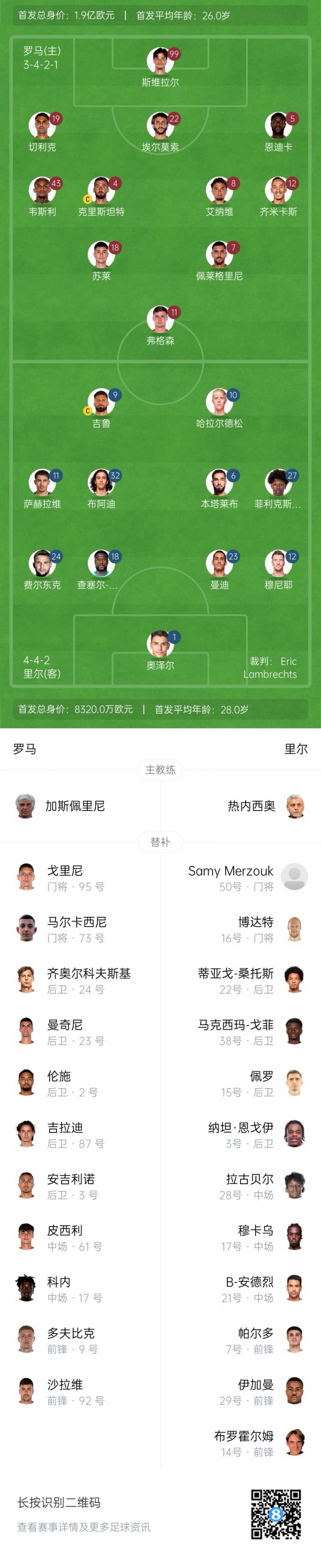 羅馬首發(fā):99-斯維拉爾、19-切利克、22-埃爾莫索、5-恩迪卡、43-韋斯利、4-克里斯坦特、8-艾納維、12-齊米卡斯、7-佩萊格里尼、18-蘇萊、11-埃文·弗格森