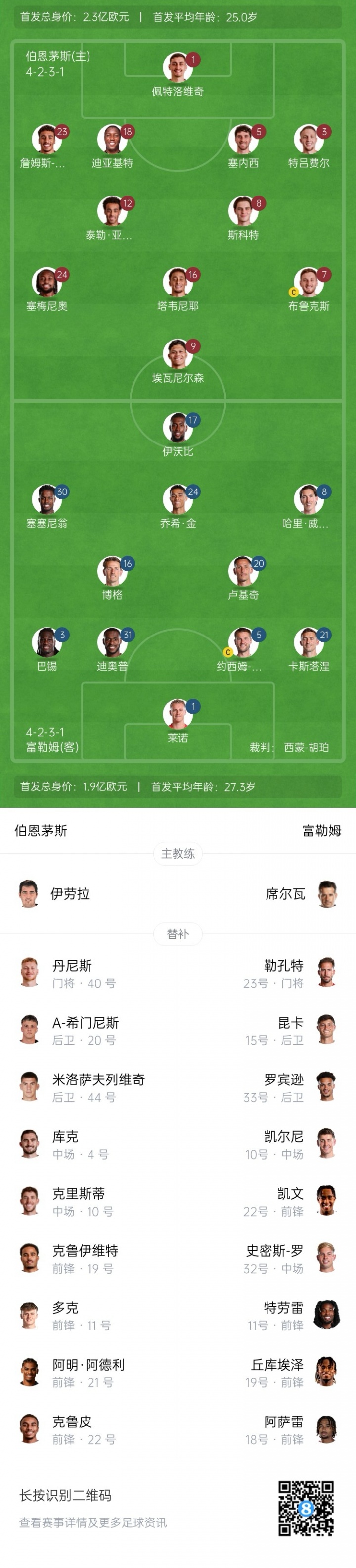 富勒姆首發(fā):1-萊諾、31-迪奧普、5-安德森、3-巴錫、21-卡斯塔涅、16-博格、20-盧基奇、30-塞塞尼翁、24-喬希-金、17-伊沃比、8-哈里-威爾遜