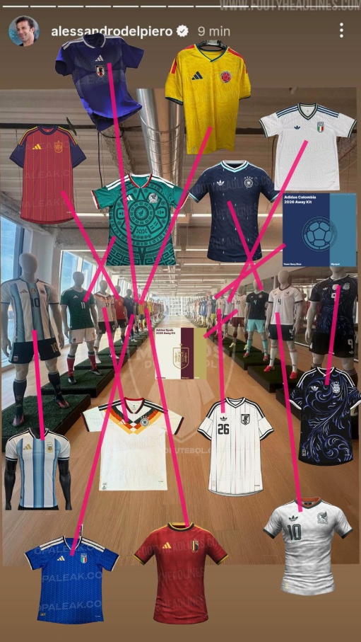 10月04日訊 今日皮耶羅更新了個人社媒快拍,然后又很快刪除了動態(tài)??炫闹袌D片為阿迪達斯合作的包括阿根廷、西班牙、德國等多個國家的2026球衣。...