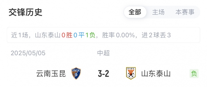 目前,山東泰山12勝6平7負(fù)積42分位列中超第6,近6輪比賽泰山4勝2平保持不??;云南玉昆8勝7平10負(fù)積31分位列中超第10,球隊(duì)近期3負(fù)2平連續(xù)五輪不勝。本賽季雙方首回合比賽,泰山遭玉昆讓二追三逆轉(zhuǎn)。
