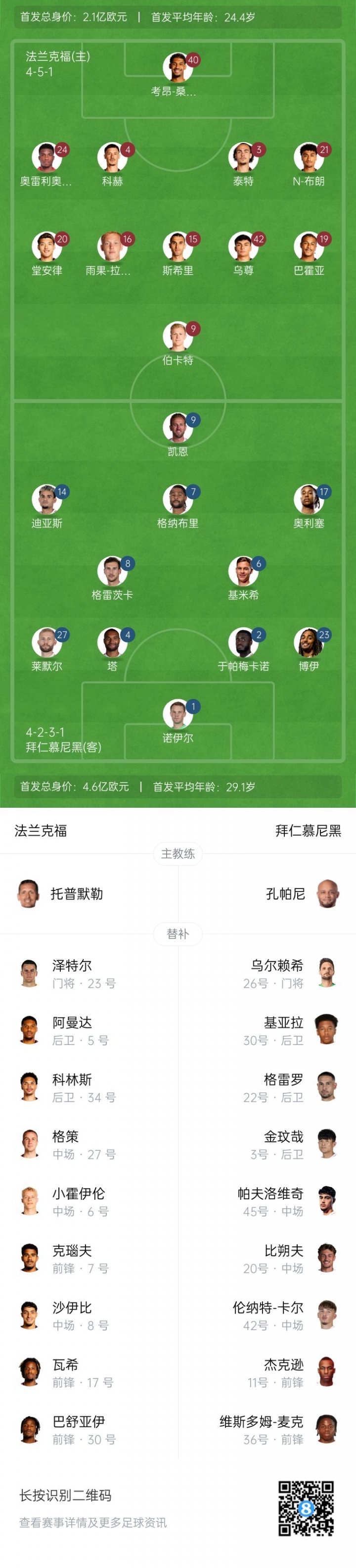 10月4日訊?德甲第6輪,法蘭克福主場(chǎng)迎戰(zhàn)拜仁比賽即將打響。賽前首發(fā)出爐。