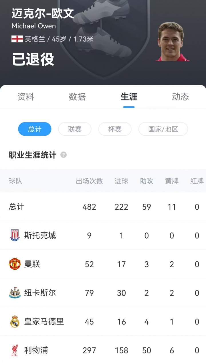 歐文出道于利物浦,曾連續(xù)獲得97/98、98/99賽季英超金靴獎,2001年獲得金球獎,但早早到來的傷病使歐文的職業(yè)生涯未能一直保持狀態(tài)。他的職業(yè)生涯輾轉于利物浦、皇馬、紐卡、曼聯(lián)等多支球隊,最終在斯托克城退役。