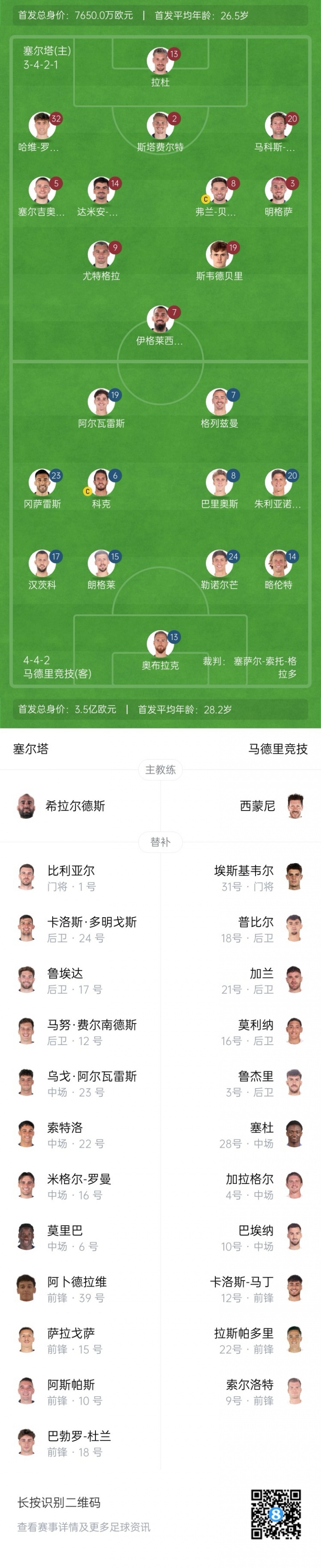 塞爾塔首發(fā):13-拉杜、20-馬科斯·阿隆索、2-斯塔費爾特、32-哈維·羅德里格斯、3-明格薩、8-弗蘭·貝爾特蘭、14-達米安·羅德里格斯、5-塞爾吉奧·卡雷拉、19-斯維貝里、9-尤特格拉、7-伊格萊西亞斯