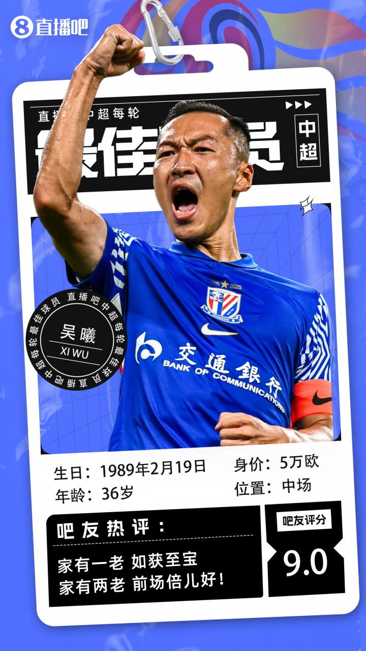 【直播吧】中超第26輪最佳球員:申花隊長吳曦!36歲依舊中流砥柱