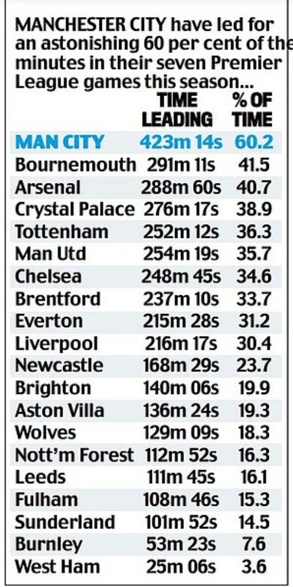 盡管目前在積分榜上只能位居第5,但曼城的領(lǐng)先時間達(dá)到了423分鐘14秒,占總比賽時間的60.2%,伯恩茅斯、阿森納和水晶宮是前四中的另外三支球隊(duì)。曼聯(lián)目前在積分榜上位居第10位,但他們在比賽中的領(lǐng)先時間可以在20支球隊(duì)中位居第5。