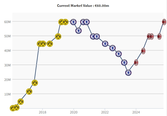 普利西奇曾在2019、2020年效力多特和切爾西時期身價達到6000萬歐,此后一路下跌至2500萬歐。