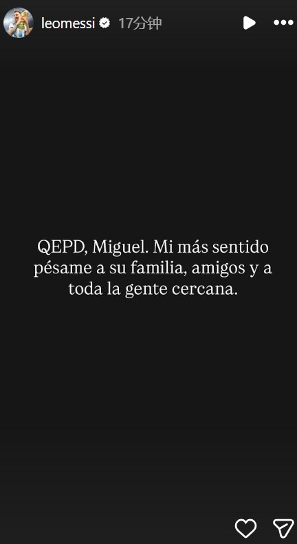 在社交媒體上,阿根廷巨星梅西表達(dá)了哀悼之情,他寫道:安息吧,米格爾!我要向他的家人、朋友以及所有親近的人致以最深切的哀悼!